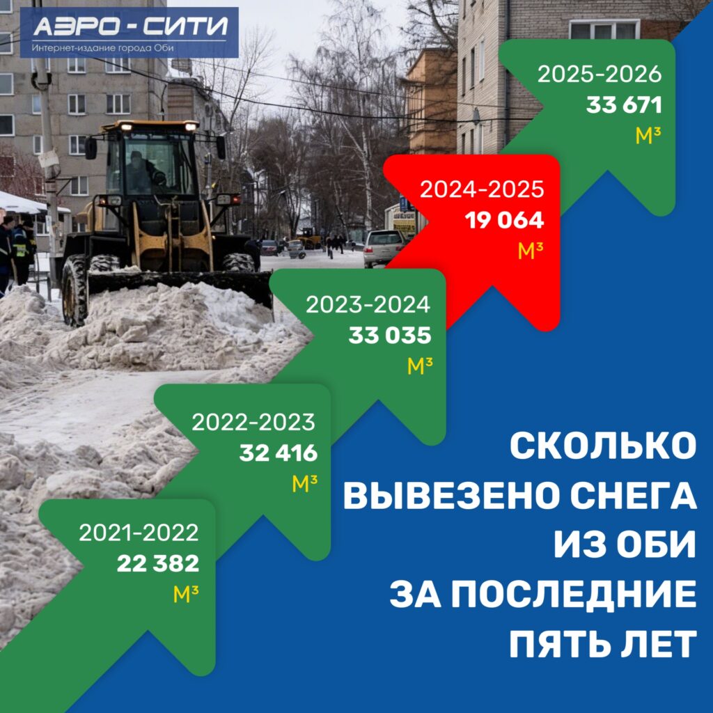 В Оби установлен рекорд по вывозу снега. С начала зимнего сезона 2025–2026 годов на снеговые полигоны вывезли 33 671 кубометр.
