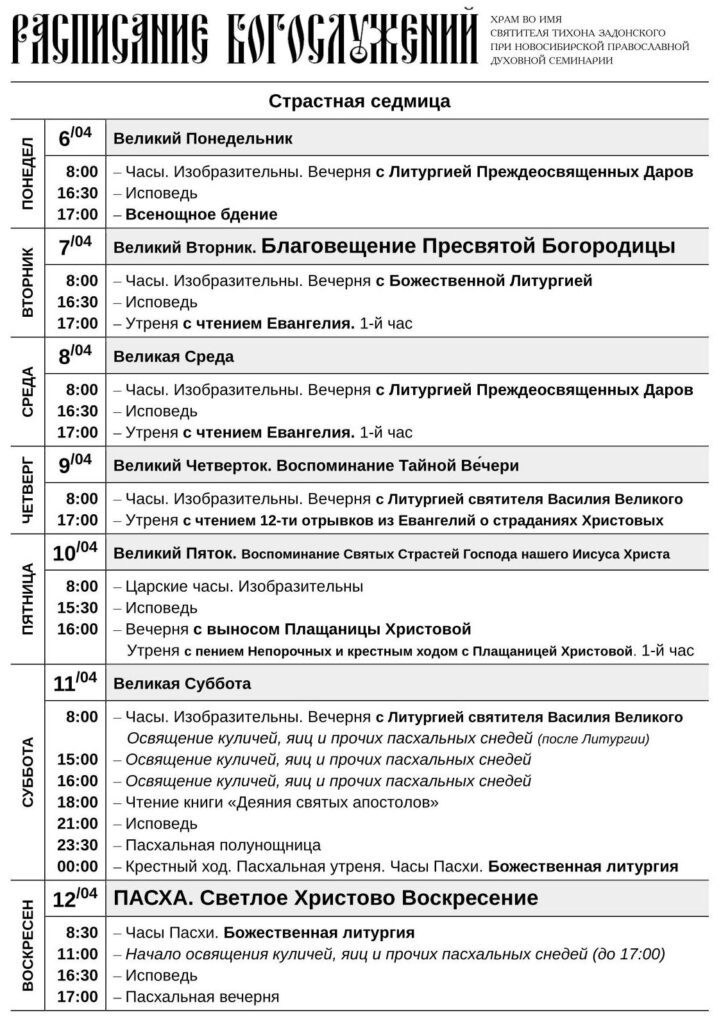 «Аэро-Сити» публикует расписание богослужений (0+) в храме во имя святителя Тихона Задонского при Новосибирской православной духовной семинарии в городе Обь, которые проходят 6 по 12 апреля 2026 года.